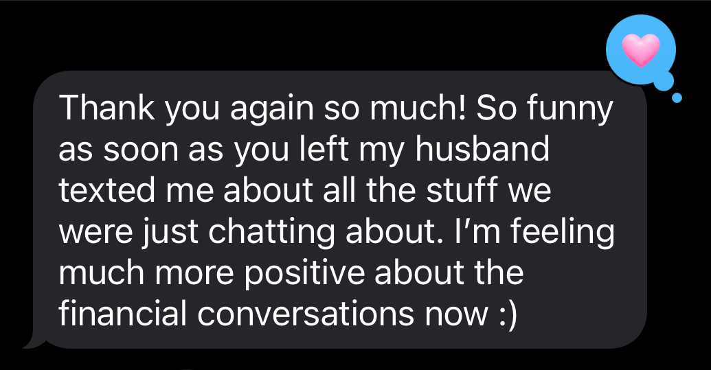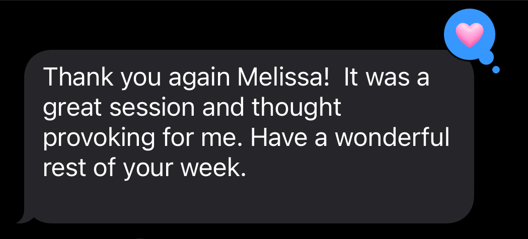 Working with Melissa was a turning point for my marriage. Even after years of personal development on my own, my husband and I kept repeating the same patterns and felt stuck. Melissa helped us stop the terrible cycles we'd gotten into, and we finally feel like a team again.